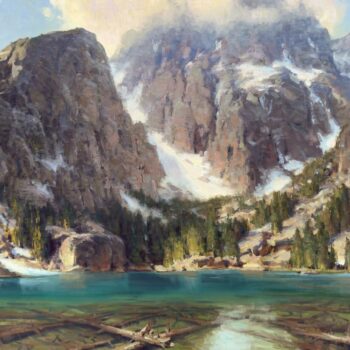 “This painting is beautifully rendered, from the water, the submerged logs and the tree patterns to the strong design of the vertical mountain faces and snow patterns. The artist’s skillful drawing and understanding/use of values helps make this difficult subject into a successful painting. It feels as if you are standing right there – a wonderful, breathtaking sense of place.“